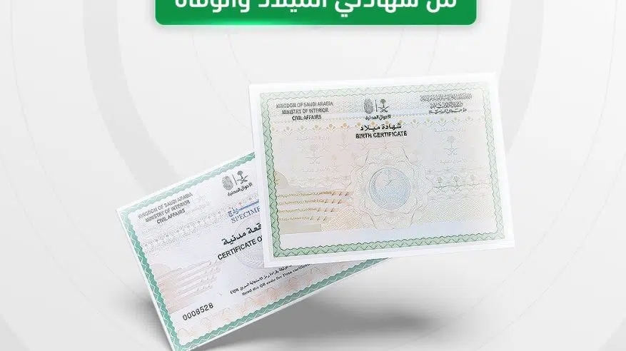 وتتميز وثائق شهادة الميلاد والوفاة الجديدة بإضافة البيانات باللغة الانجليزية ورمز الاستجابة السريع (QR)، الذي يمكن من خلاله التأكد من معلومات الوثيقة وطباعتها عبر منصة (أبشر).