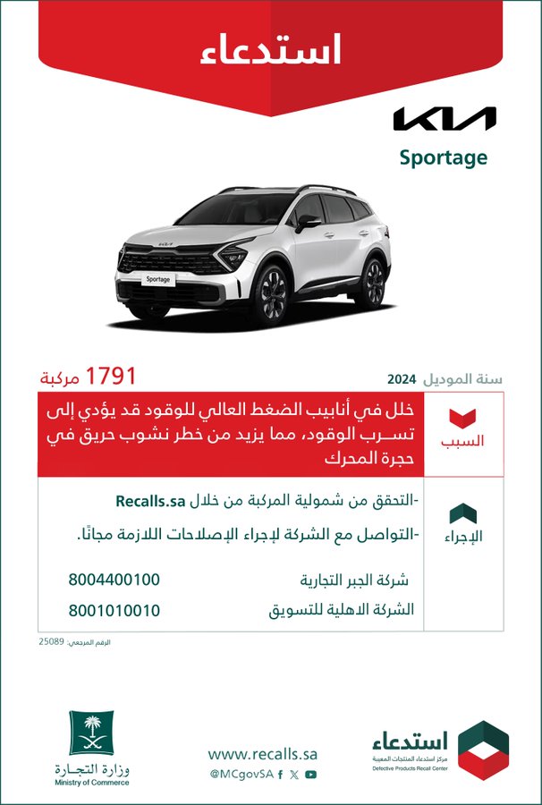 أعلنت وزارة التجارة، عن استدعاء 1,791 مركبة من طراز “كيا – سبورتاج” موديل 2024، وذلك لخلل في أنابيب الضغط العالي للوقود.