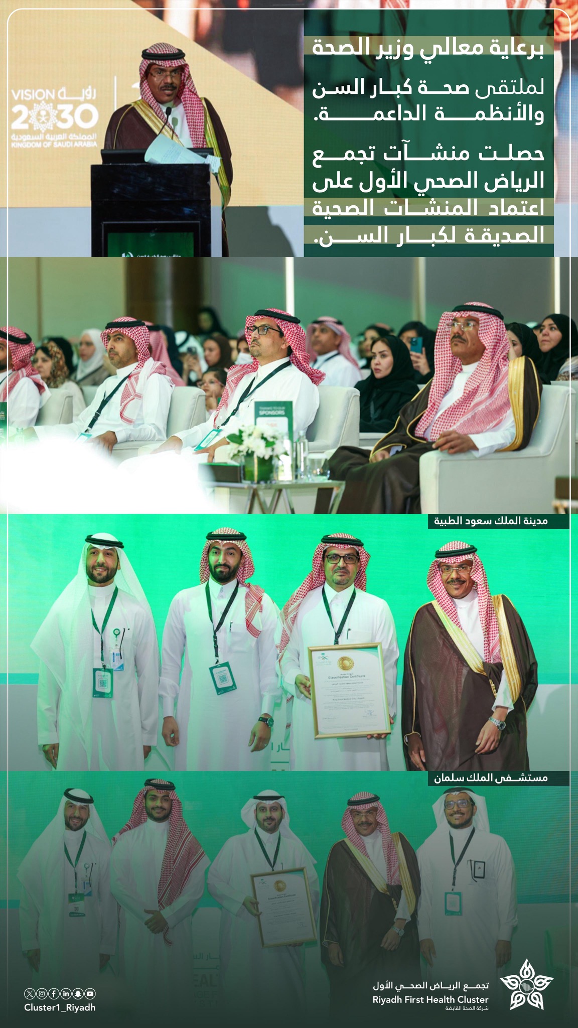 برعاية معالي وزير الصحة، شهد ملتقى «صحة كبار السن والأنظمة الداعمة» تكريم مدينة الملك سعود الطبية ومستشفى الملك سلمان التابعَين لـ تجمع الرياض الصحي الأول، بمناسبة حصولهما على اعتماد المنشآت الصحية الصديقة لكبار السن، تقديرًا لجهودهما في تهيئة بيئة رعاية متكاملة تضمن حياة كريمة للمسنين وتُعنى بصحتهم واحتياجاتهم.