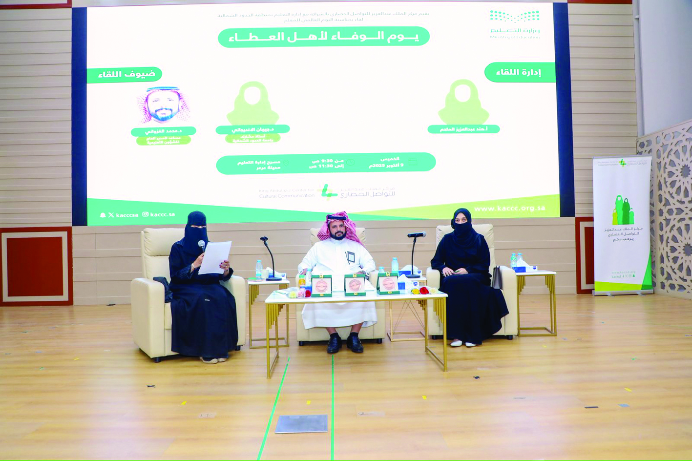 نظّم مركز الملك عبدالعزيز للتواصل الحضاري بالشراكة مع إدارة التعليم بمنطقة الحدود الشمالية لقاءً حوارياً بمناسبة يوم المعلم بعنوان يوم الوفاء لأهل العطاء، وذلك على مسرح إدارة التعليم بمدينة عرعر.