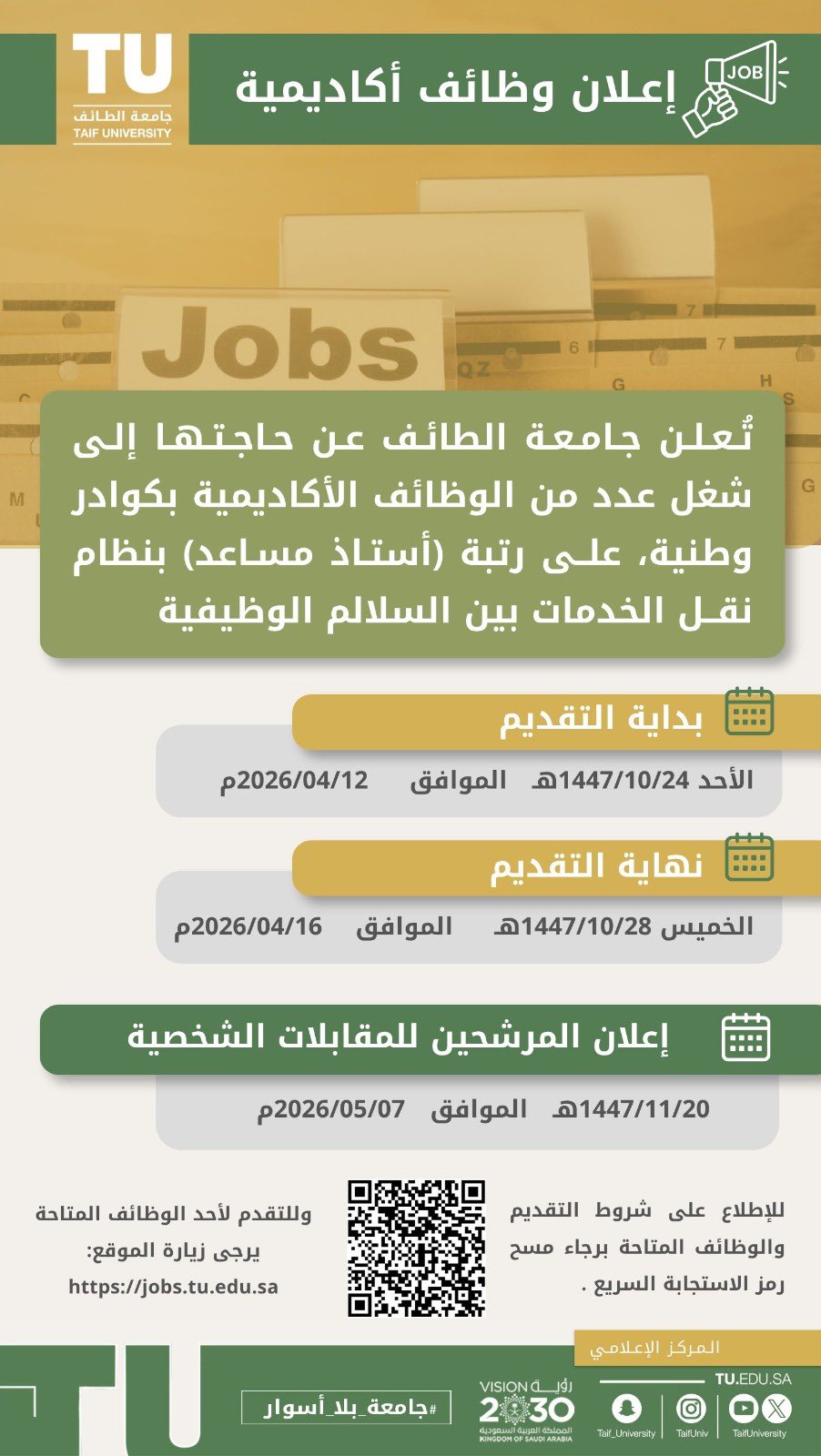 تعلن جامعة الطائف عن حاجتها إلى شغل عدد من الوظائف الأكاديمية بكوادر وطنية، على رتبة أستاذ مساعد بنظام نقل الخدمات بين السلالم الوظيفية على النحو التالي: