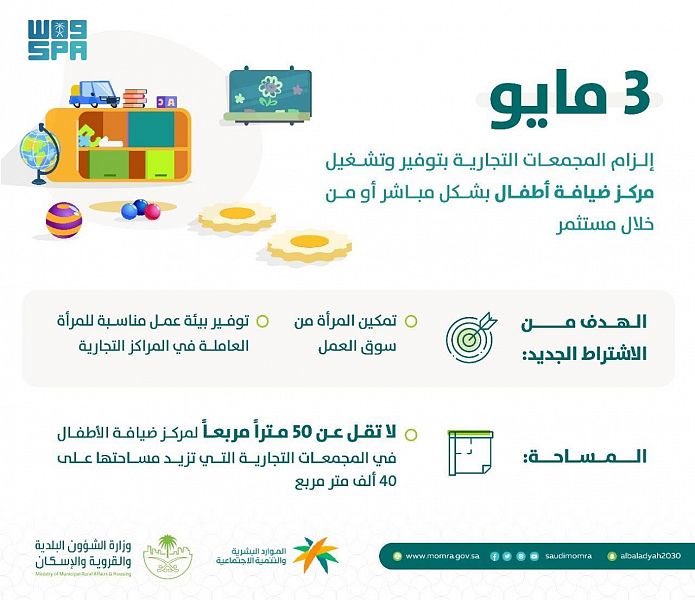 حددت وزارة الشؤون البلدية والقروية والإسكان 3 مايو 2021 م للبدء في إلزام ملاك المراكز التجارية (المولات) التي تبلغ مساحتها (40.000) متر مربع فأكثر بتوفير مساحة مخصصة لمركز ضيافة أطفال بحد أدنى (50) مترًا مربعًا.