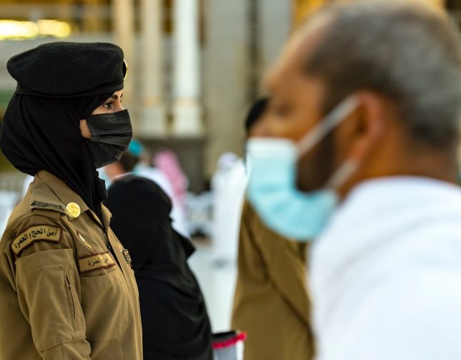 وأظهرت الصور التي نشرها حساب “الداخلية” على موقع “تويتر” عنصر نسائي ضمن قوات أمن الحج والعمرة، وهي تقف في صحن المطاف لمتابعة التزام المعتمرين بالإجراءات الاحترازية.
