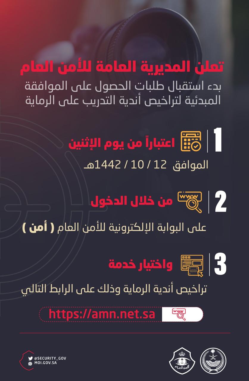 أعلنت المديرية العامة للأمن العام عن البدء باستقبال طلبات الحصول على الموافقة المبدئية لتراخيص أندية التدريب على الرماية، اعتبارًا من يوم الاثنين الموافق 12 – 10 – 1442 هـ، من خلال الدخول على البوابة الإلكترونية للأمن العام (أمن)، واختيار خدمة تراخيص أندية الرماية، وذلك على الرابط التالي: https://amn.net.sa