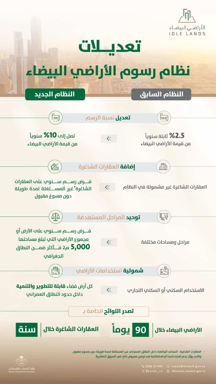 وشملت التعديلات أيضًا إعادة النظر في المساحات الخاضعة للرسم، حيث يشمل النظام الأراضي التي لا تقل مساحتها عن 5 آلاف متر مربع، وتهدف هذه الإجراءات إلى زيادة المعروض العقاري، وتحقيق الاستخدام الأمثل للأراضي بما يخدم المواطنين والسوق العقارية.