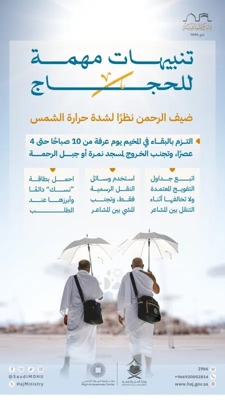 وشدد وزارة الحج والعمرة عبر منصة إكس على أهمية اتباع التعليمات الصحية، مشددة على تجنب الخروج لمسجد نمرة أو جبل الرحمة خلال ذروة الشمس، مع ضرورة استخدام وسائل النقل الرسمية عند التنقل بين المشاعر، واتباع الجداول المعتمدة للتفويج.