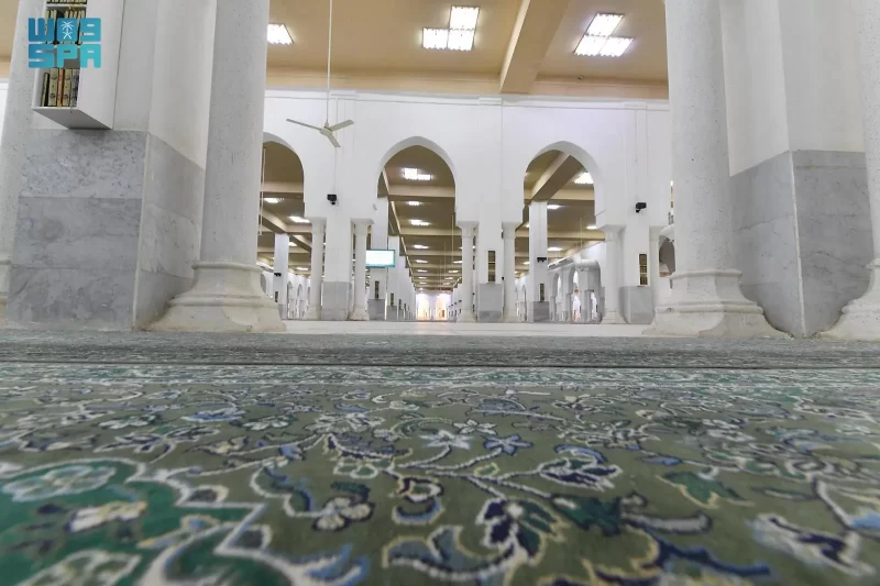 وضمن موسم حج هذا العام، فرشت وزارة الشؤون الإسلامية والدعوة والإرشاد المسجد بسجاد فاخر على مساحة بلغت (125) ألف متر مربع، وشرعت في تنفيذ حزمة من المشاريع التطويرية النوعية، شملت تهيئة بيئة المسجد بما يعزز راحة الحجاج وسهولة أدائهم للمناسك، وتركيب (19) مظلة في الساحة الخلفية للمسجد، تسهم في خفض درجة الحرارة بمعدل (10) درجات مئوية، ودهان الأرضيات بمادة عاكسة لأشعة الشمس، إلى جانب تشغيل (117) مروحة ضباب موصولة بشبكات مياه عالية الضغط لتلطيف أجواء الساحات المحيطة، بما يسهم في خفض الحرارة بمعدل (9) درجات مئوية، بالإضافة إلى تحديث نظام التهوية والتكييف بنظام تحكم ذكي، يراقب جودة الهواء ومستويات ثاني أكسيد الكربون، ويتيح تجديد الهواء داخل المسجد بنسبة (100%) مرتين في الساعة، بما يضمن بيئة صحية وآمنة لضيوف الرحمن.